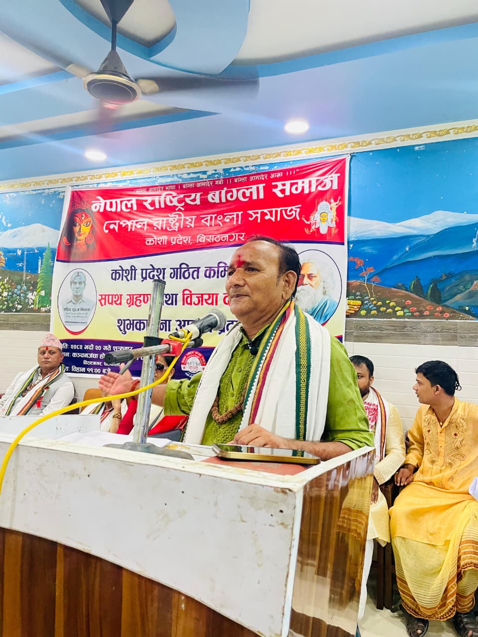 विराटनगर, भदौ २०। नेपाल राष्ट्रिय बांग्ला समाजको नवगठित कोशी प्रदेश समितिका पदाधिकारीहरूले शुक्रबार एक विशेष समारोहबीच सपथ ग्रहण गरेका छन्। विराटनगरको एक पार्टी प्यालेसमा आयोजित कार्यक्रममार्फत समाजका संस्थापक अध्यक्ष पार्थो सरकारले पदाधिकारीहरूलाई सपथ गराएका हुन्।