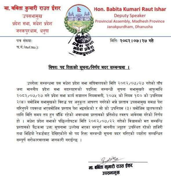 सचिवालयको सूचनामा भनिएको छ कि “प्रदेशसभा बैठकको अभिलेखअनुसार नेपालको संविधानको धारा १८०(घ) बमोजिम लगातार १० बैठकमा अनुपस्थित रहेका सांसदहरू कात्तिक २७ गतेदेखि पदमुक्त भएको हुँदा निजहरूको सदस्यताको स्थान रिक्त भएको” हो। उक्त सूचना नेपाल राजपत्रमा समेत प्रकाशित भइसकेको छ।