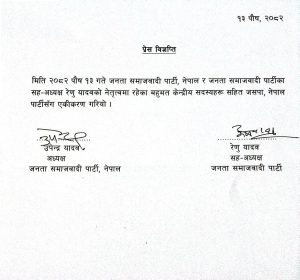 काठमाडौँ। जनता समाजवादी पार्टी (जसपा) की सहअध्यक्ष रेणु यादव र उपमहासचिव प्रदीप यादवले पार्टी परित्याग गरेका छन्। उनीहरू आफ्ना समर्थक बहुमत केन्द्रीय सदस्यसहित लोकतान्त्रिक समाजवादी पार्टी (लोसपा) र जनता समाजवादी पार्टी, नेपालबीच भएको एकतालाई स्वीकार गर्दै बुधबार जसपा नेपालका अध्यक्ष उपेन्द्र यादवसँग सहमतिपत्रमा हस्ताक्षर गरेका हुन्।
